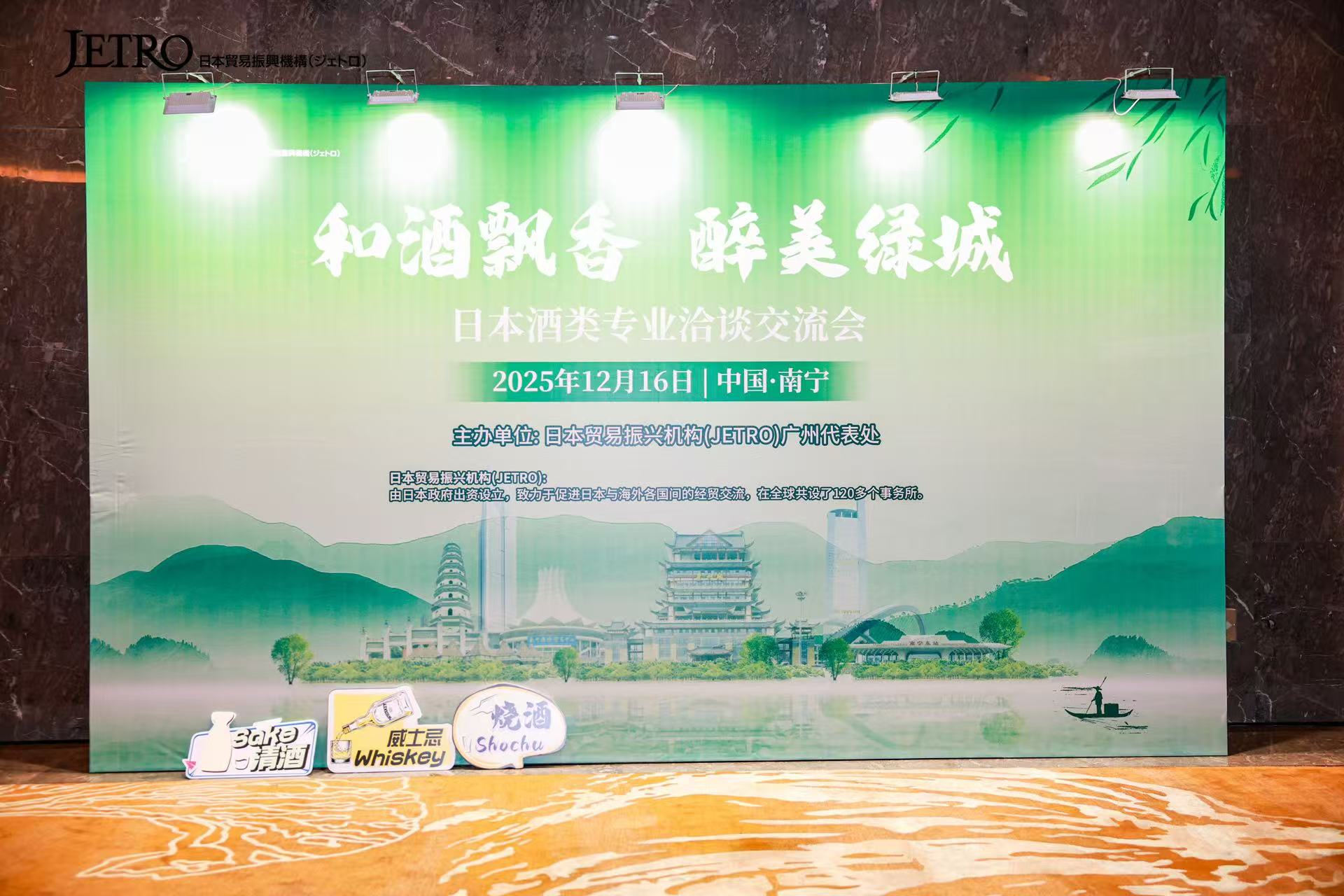 12/16萨摩酒造(上海)商贸有限公司出展了由日本贸易振兴机构Jetro中国举办的“和酒文化、醉美绿城”广西南宁站的酒类商谈会。南宁市,一座充满魅力的南方都市,气候怡人,12月中旬的天气、身着短袖竟然毫无违和感。