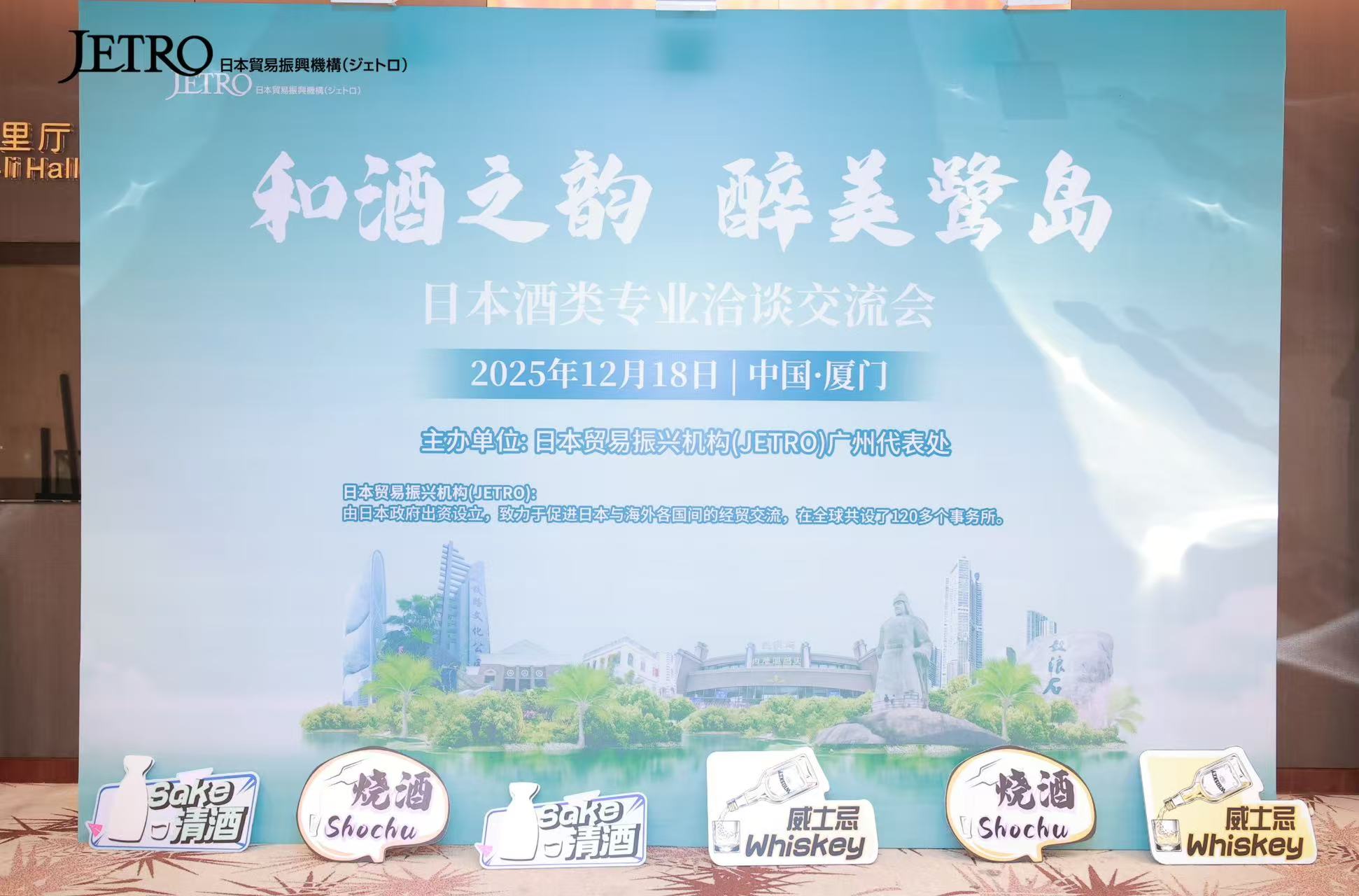12/18萨摩酒造(上海)商贸有限公司辗转福建省厦门市,继续出展了“和酒文化、醉美鹭岛”酒类商谈会、再次近距离的向国内酒类从业人员们展示了烧酎的独特魅力。在此,再次感谢日本贸易振兴机构Jetro的安排与付出,创造出了日本本格烧酎文化与国内酒类行业有了很好地交流与互助的契机。